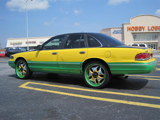 I see some pretty sweet paint jobs around town. Most of the cars have been jacked up - as in height off the ground and then have very large, 22 or 24 inch wheels on them. One of my favorites is blue and orange like some old school cop car and then has larger than life wheels on it. This green and yellow one I see a lot - it's not as spruced up as some of the others, but it was finally parked somewhere accessible when I happen to have my camera.